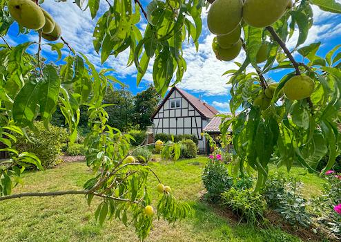 Auch der Hof, mit seinen sehr gepflegten Nebengebäuden und einem massiven Turmhaus, führt die Stimmung weiter fort. Alles ausgerichtet auf das unabhängige, entspannte Landleben mit Garten und Kleintieren zur Selbstversorgung. Hier wartet das Obst auf seine Ernte und die Katze schläft genüsslich in der Sonne.