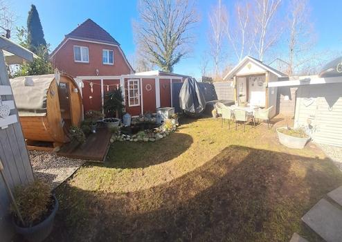 Das Grundstück hat eine Fläche von ca. 320 m².Darauf befindet sich die massiv erbaute Doppelhaushälfte aus dem Jahr 1998.Ein schöner Garten mit überdachter Terasse/Eingangsbereich sowie zwei Gartenhäuser.