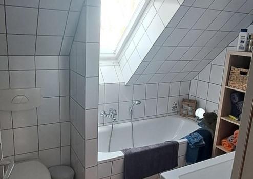 Über eine Holztreppe gelangt man in das 1. Obergeschoss. Hier befinden sich 3 Zimmer ein großes Bad mit Badewanne und Dusche.