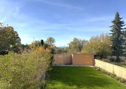 Die große Sonnenterrasse mit dem einladenden Garten und dem geräumigen Gartenhaus bieten Platz zum Spielen und Gärtnern.