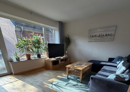 Das Wohnzimmer mit der großen Fensterfront (3-fach verglast) ist sonnig und hell. Der Balkon befindet sich direkt davor und lädt zu sonnigen Stunden ein. Eine Markise und Seitenmarkise ist vorhanden. Die Ausrichtung ist Süd/West.