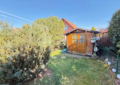 Der pflegeleichte Garten ist nicht einsehbar und verfügt über ein praktisches Gartenhaus. Zwei PKW-Stellplätze direkt am Haus runden das Angebot komfortabel ab.