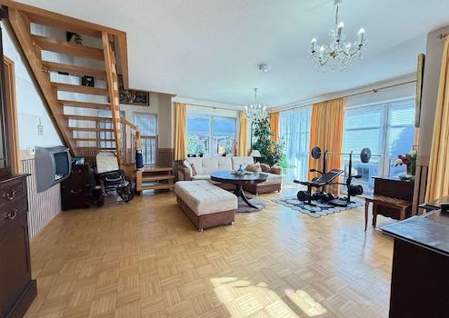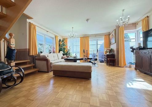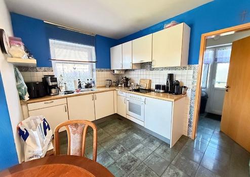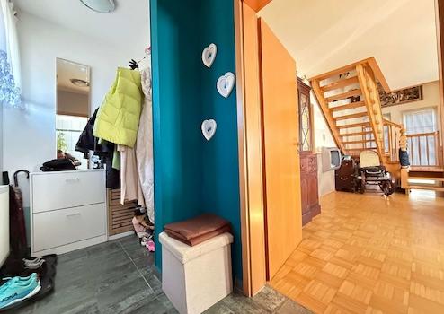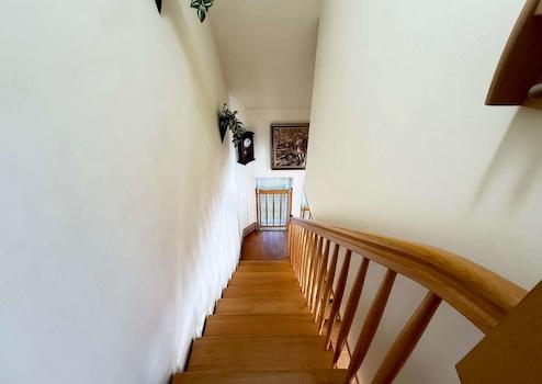 Die vorhandene Einbauküche ist bereits im Kaufpreis enthalten und praktisch ausgestattet. Eine offene Holztreppe verbindet den Wohnbereich mit dem Obergeschoss und verleiht dem Haus eine warme, wohnliche Note.