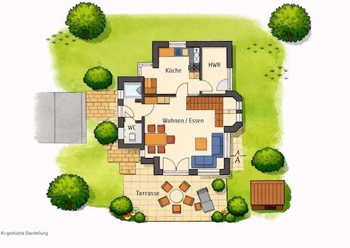 Die Immobilie überzeugt durch eine solide und funktionale Ausstattung, die sowohl für die Eigennutzung als auch für die Ferienvermietung bestens geeignet ist. Der helle Wohn- und Essbereich bildet den Mittelpunkt des Hauses und bietet durch große Fensterflächen eine angenehme Wohnatmosphäre mit direktem Zugang in den geschützten, nicht einsehbaren Garten.