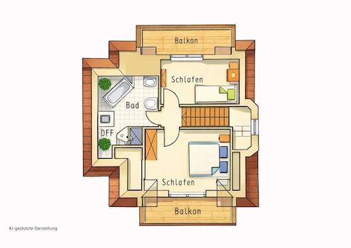 Im Obergeschoss befinden sich zwei gut geschnittene Schlafzimmer, die jeweils über einen eigenen Balkon verfügen und einen schönen Blick ins Grüne bieten. Das Badezimmer ist mit Dusche und Badewanne ausgestattet und bietet somit Komfort für unterschiedliche Bedürfnisse.