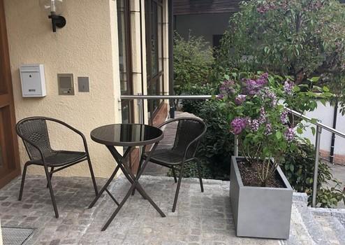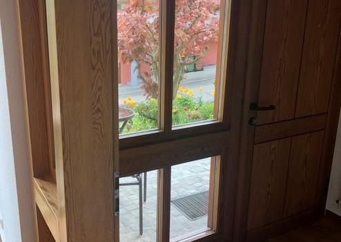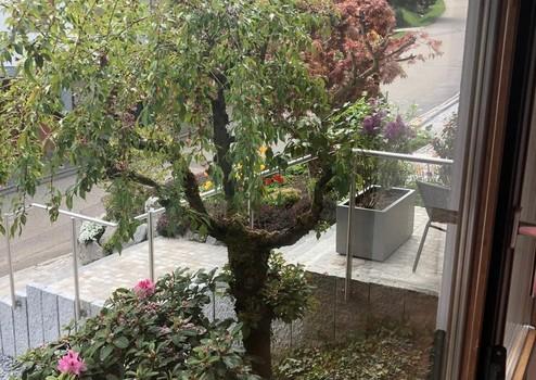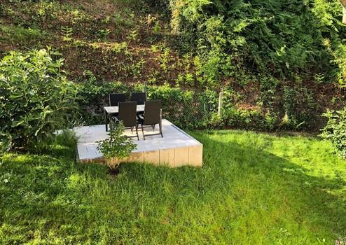 Ein schöner Weitblick u.a. ins Grüne, Sprossenfenster, Parkett bzw Laminatböden sorgen ebenfalls für eine gemütliche Atmosphäre. Im Wohnzimmer befindet sich ein schöner Steinboden mit Fußbodenheizung. Zum Garten mit schöner Terrasse zur Alleinnutzung gelangt man über das Treppenhaus. Ein weiterer schöner kleiner Sitzbereich befindet sich im Eingangsbereich.