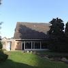 Übergroße Garage am Haus mit rückseitigem Zugang zum Garten.