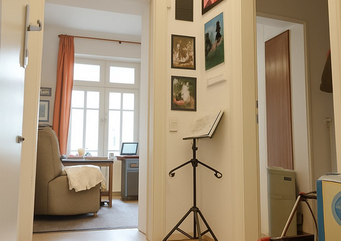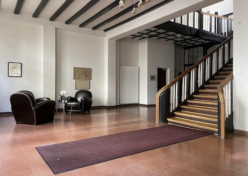 Die Wohnung erreicht man nach Betreten der sehr weitläufigen Eingangshalle mit original Jugendstil-Ornamenten und -Zierfenstern - die Sie dann anteilig mitbesitzen und mitnutzen können - über die originale, restaurierte breite Holztreppe oder den Aufzug.