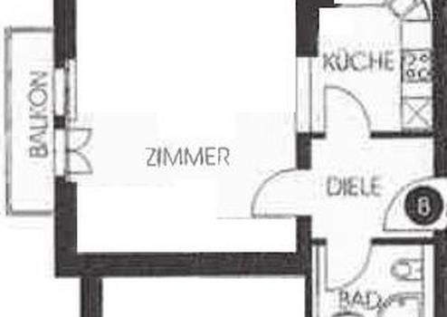 1 großes Wohn-/Schlafzimmer mit ca. 3,50m hohen Decken, Diele, Küche, Duschbad und Balkon nach Süden.