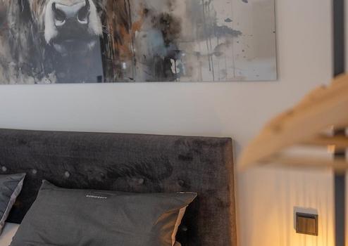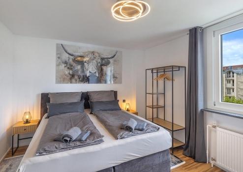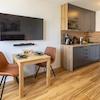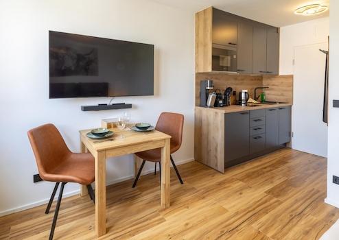Das Apartment wird voll möbliert und geschmackvoll eingerichtet angeboten. Die moderne Ausstattung wurde mit viel Sorgfalt ausgewählt und schafft ein hochwertiges, sofort bezugsfertiges Wohnambiente. Zur Einrichtung gehören unter anderem ein komfortables Kingsize-Bett, ein großer Smart-TV mit Kabelfernsehen, schnelles WLAN sowie eine stilvolle Möblierung des Wohnbereichs.