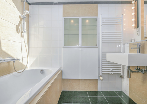 Im Mietpreis von 790 € kalt sind bereits die Einbauküche, die Waschmaschine, alle Lampen, ein großer Kleiderschrank und ein Doppelbett (ohne Matratze) enthalten – ideal für einen unkomplizierten Einzug. Das helle Hauptbad verfügt über eine Badewanne und Dachfenster, die für eine natürliche Belichtung sorgen. Das kleinere Bad bietet neben einem WC und einer Dusche auch den Anschluss für die Waschmaschine.