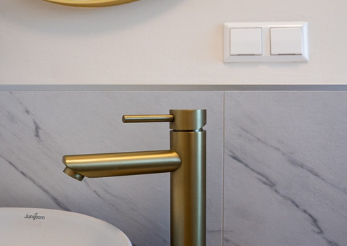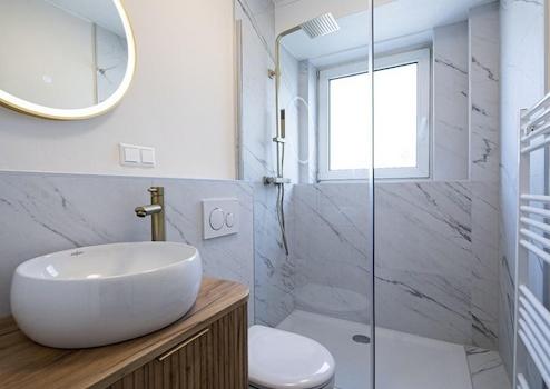 • Kernsanierung des Badezimmers inklusive Leitungen mit neuer Ausstattung (Dusche, Handtuchheizkörper, wandhängendes WC, Waschtisch mit Aufsatzbecken sowie beleuchteter Spiegel) in einem harmonisch abgestimmten Design