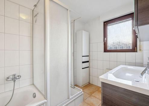Das Badezimmer ist funktional ausgestattet und verfügt sowohl über eine Badewanne als auch über eine separate Dusche. Das WC befindet sich in einem eigenen, separaten Raum.