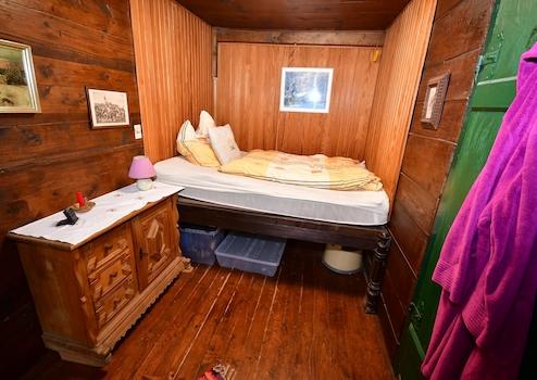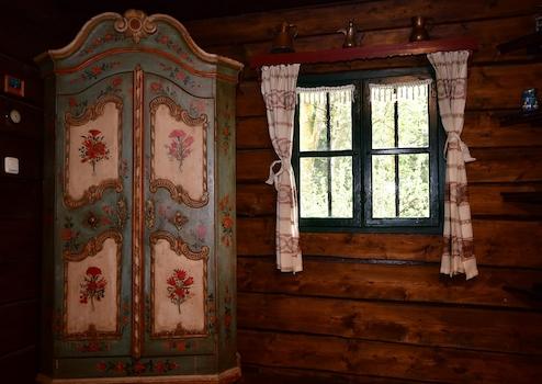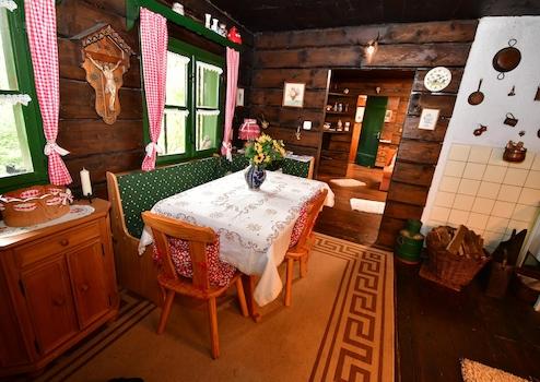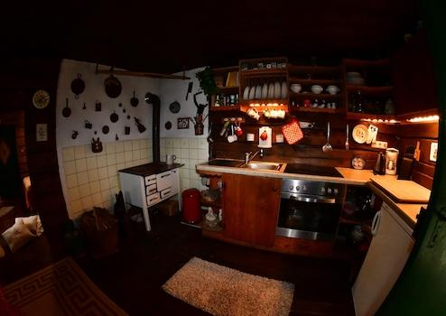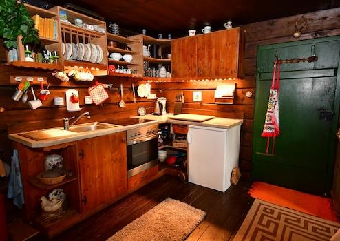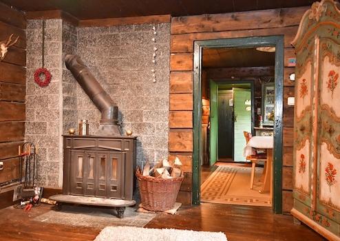 Wenn Sie die Hütte betreten, empfängt Sie der Duft von sonnenwarmem Holz und brennendem Scheitholz. Im Wohnzimmer sorgt ein großer Kaminofen für knisternde Gemütlichkeit an kalten Winterabenden.