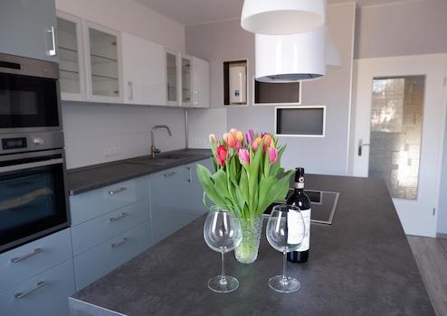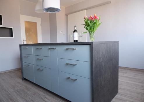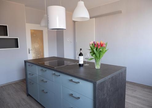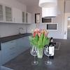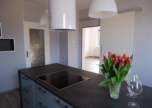 Die neue moderne Einbauküche verfügt über Kühl-, Gefrierschrank, Geschirrspüler, Backofen, Mikrowelle und ein Induktionskochfeld. Eine großzügige Kochinsel lädt zum gemeinsamen Kochen und Genießen ein.