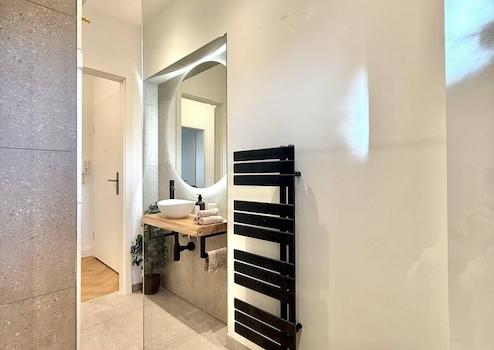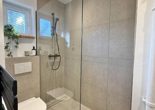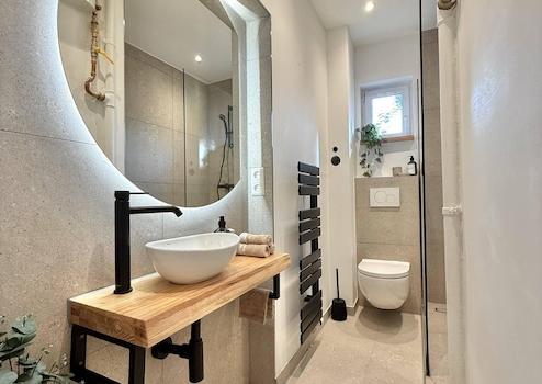* Modernes Tageslichtbad - mit Walk-In Dusche, edlen schwarzen Armaturen und durchdachtem Designkonzept.