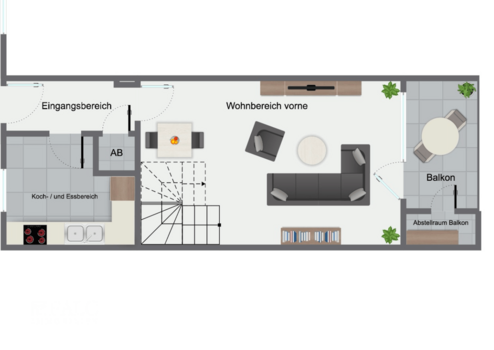 Der Eingangsbereich führt rechter Hand in den Koch-/ und Essbereich, welcher genügend Raum für einen gemütlichen Esstisch bietet. Ebenfalls im Eingangsbereich befindet sich neben der Küche ein praktischer Abstellraum für Ihre Vorräte.