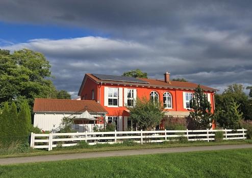Die moderne Designervilla steht auf einem von der Straße abseits gelegenen Grundstück in ruhigster Lage am Feld mit Fernblick auf den Stadtberger Wald.