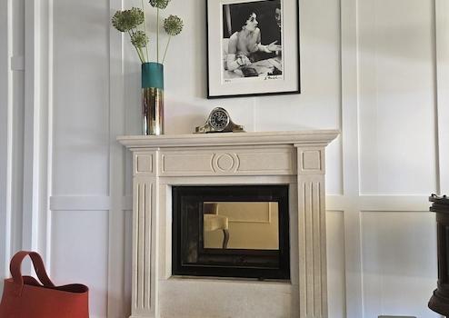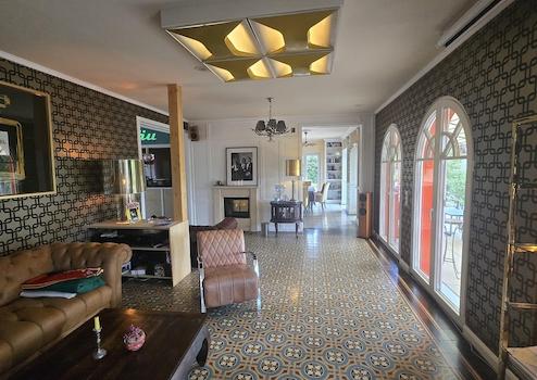 Das Haus wurde 2023/2024 neu gestylt und eingerichtet, hat teils weiße Holzvertäfelungen, kombiniert mit teuren Designertapeten. Das apricotfarbene Esszimmer mit Blick auf Pool und Garten wird von einem weißlackierten Bücherregal umsäumt. Das Wohnzimmer trägt eine goldene Samtmustertapete mit Blick durch die Rundbogenfenster auf die Westterrasse. Die Böden sind in den Bädern Antikmarmor, in den Wohnräumen teils Zementfliesen mit wunderschönen Mustern.