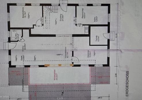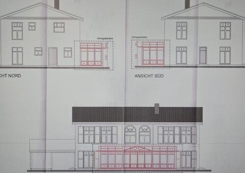 Das Wohnzimmer ist durch einen bereits genehmigten Wintergarten um 26 m² (10 m breit, 3 m tief) nach Westen erweiterbar.