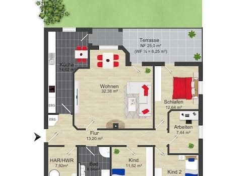 Die durchdachte Raumaufteilung überzeugt durch einen großzügigen Flur, einen Hauswirtschafts- und Hausanschlussraum, ein modernes Tageslichtbad mit Badewanne und Dusche, zwei Kinderzimmer, ein Arbeitszimmer, ein Schlafzimmer sowie ein lichtdurchflutetes Wohnzimmer und eine separate Küche. Die Terrasse, welche zu entspannten Stunden im Freien einlädt, kann von der Küche sowie vom Wohn- und Schlafzimmer begangen werden.
