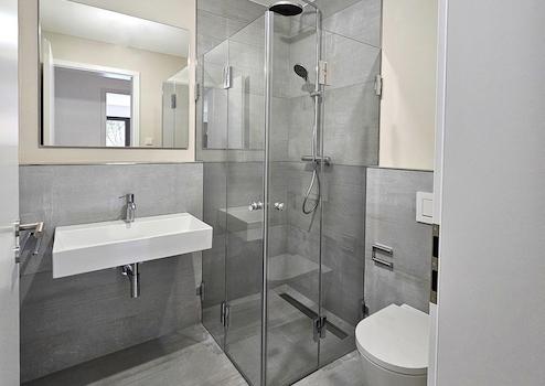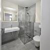 Das moderne Badezimmer ist hochwertig ausgestattet inklusive einer bodentief gefliesten Dusche.