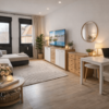 Der Wohn- und Schlafbereich ist hell und freundlich gestaltet. Zwei große Fenster sorgen für viel Tageslicht und schaffen eine angenehme Wohnatmosphäre. Der moderne Bodenbelag in Holzoptik unterstreicht den zeitgemäßen Charakter der Wohnung. Der Raum bietet ausreichend Platz für Wohnen, Schlafen und Arbeiten.