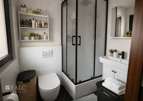 Das modern gestaltete Badezimmer verfügt über eine Dusche mit Glasabtrennung, Waschbecken sowie WC und befindet sich ebenfalls in einem gepflegten Zustand.