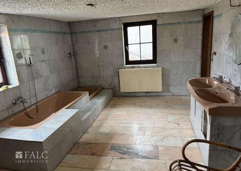 Großes, helles Badezimmer mit Badewanne, Dusche, Fenster