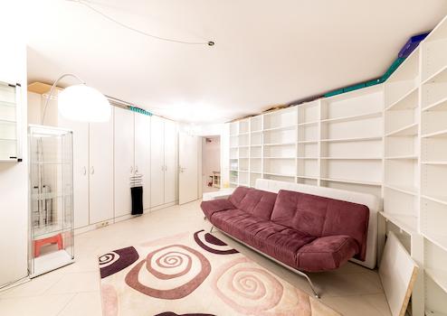Der beheizte Hobbyraum ist mit einem Einbauregal ausgestattet, sodass er zum Beispiel als Bibliothek genutzt werden kann.