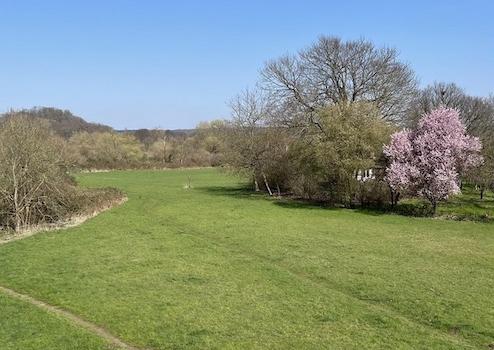 Nach wenigen Metern am Spielplatz vorbei, laden Wander- und Radwege zur Freizeitgestaltung im direkt angrenzenden Naturschutzgebiet ein.