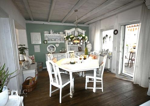 Treppenhaus, Flur, neues Badezimmer mit Dusche, 2 Schlafzimmer, Wohn-Esszimmer mit Einbauküche und Kamin. Das Erdgeschoss verfügt über einen Balkon und einen Wintergarten mit Zugang zum Garten. WFL: ca. 82 m².