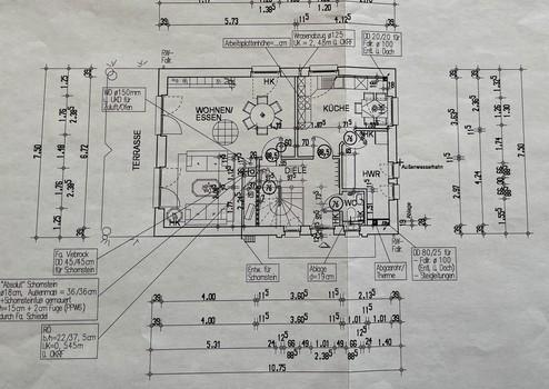 Der Wohn- und Essbereich verfügt über einen runden Kaminofen der Firma Spartherm, der von beiden Seiten gut einsehbar ist. Der Fußboden ist mit Fliesen belegt, bodentiefe Fenster sorgen für viel Helligkeit. Von hier haben Sie einen direkten Zugang zur nach Süden ausgerichteten Terrasse, von der Sie einen großartigen Blick bis zum angrenzenden Waldgebiet haben und die Sonne genießen können. Die Terrasse bietet zudem die Möglichkeit für die Anlage eines Gartenteiches.