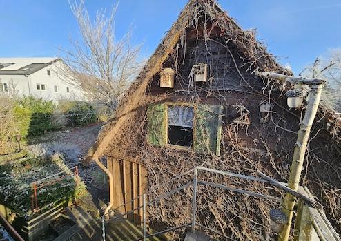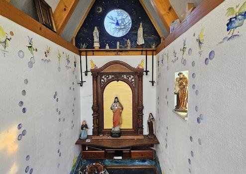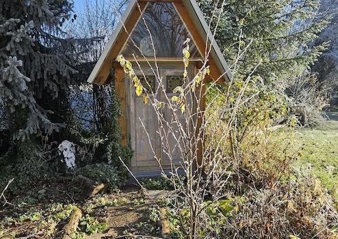 Während die kleinere, vermietete Wohnung im Erdgeschoss eine uneinsehbare Terrasse besitzt, hat die große, 1995 renovierte Dachgeschoss-Wohnung nicht nur einen Balkon, sondern über eine Außentreppe auch einen direkten Zugang zum Garten. Und hier tut sich auf über 2000 Quadratmetern ein wahres Paradies auf von Bäumen, Büschen, einer zusätzlichen Terrasse, einem eigenen, geweihten! Kappellchen, zahlreichen kleinen Nebengebäuden und und und...