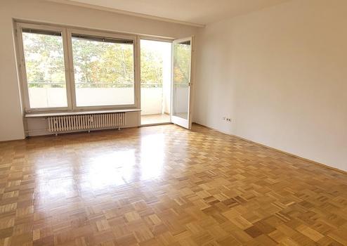 Das großzügige Wohnzimmer mit 26 qm ist mit Parkett ausgelegt und und verfügt zudem über einen direkten Zugang zum Balkon. Eine Fensterfront, die sich über eine gesamte Zimmerseite erstreckt, lässt viel Tageslicht herein und sorgt für ein helles und einladendes Ambiente.