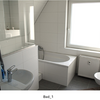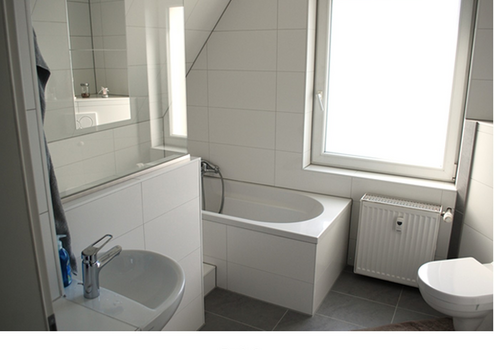 Badezimmer: Tageslichtbad mit Badewanne, Dusche, WC und beleuchtetem Wandschrank,