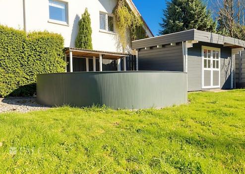 Im Erdgeschoss befinden sich eine separate Küche, ein Gäste-WC, ein praktischer Abstellraum sowie ein großzügiges Wohn- und Esszimmer mit direktem Zugang zur Terrasse und zum Garten. Große Fensterflächen sorgen für eine helle und freundliche Wohnatmosphäre sowie eine sehr gute Belichtung der Räume.