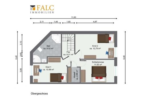Das Obergeschoss verfügt über ein Schlafzimmer, ein Badezimmer mit Badewanne und Dusche sowie zwei weitere Zimmer, die flexibel als Kinderzimmer, Gästezimmer oder Arbeitszimmer genutzt werden können.