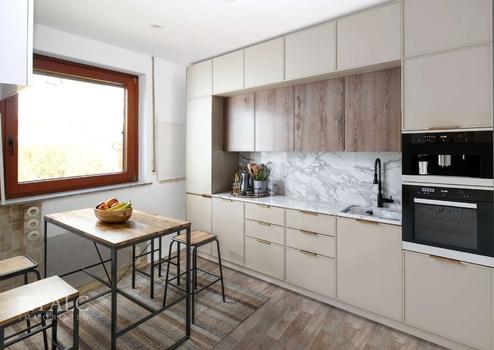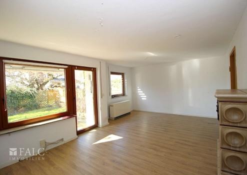 Im Erdgeschoss ist die Küche noch separat vom Wohn- Esszimmer getrennt. (Ja, die Wand kann bestimmt entfernt werden) Der Kachelofen wird von der Küche aus befeuert und bietet eine wohlige, kostengünstige Wärme im Haus. Das Wohn-Esszimmer hat den direkten, nahezu ebenen Zugang zur Terrasse und zum nach Süd-Westen orientierten Garten. Dieser ist auch aus dem Untergeschoss über eine Treppe zu erreichen.