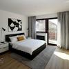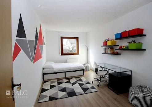 Das Erste Obergeschoss beherbergt ein Duschbad, ein Schlafzimmer, ein Kinderzimmer und ein kleines Arbeitszimmer. Das Dachgeschoss kann als separates Studio dienen mit einem Schlafbereich, einem Wohnbereich und einem Bad mit Badewanne.