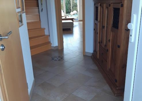 Keller gefliest, EG gefliest, obere Stockwerke Echtholzparkett.