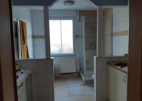 Jedes Fenster mit Außenrollo. Waschtische mit Unterschrank in den Bädern. Bäder raumhoch gefliest.