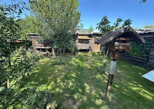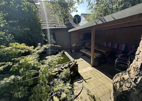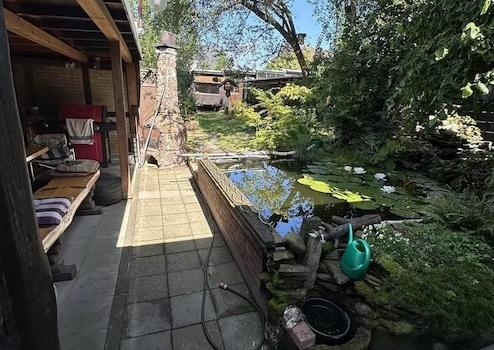 Seitliche Terrasse auf der Garage sowie vor dem Kamin- und Wohnzimmer mit angrenzendem Teich und seitlich gelegener Gartenhütte zum grillen. Rasenfläche mit vereinzelten Jungbäumen und im hinteren Gartenteil abschließend Heimwerkerhütten. Voll mit Strom erschlossen und zwei (separat absperrbaren) Kaltwasserhähnen nahe dem Haus.