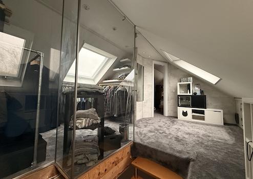 Kleiner Flur mit Drempelschränken, geschlossenes Zimmer mit Giebelfenstern und Drempelschränken. Durch Glaswände und Glastür vom Flur und Treppenaufgang abgetrennter Schrankbereich. Dachschrägenfenster erhellen Flur und Ankleideraum. Holzboden komplett mit Teppich ausgelegt. Dachstuhl komplett aus Holz in Gemeinschaftsbauweise mit der Nachbarhaushälfte.