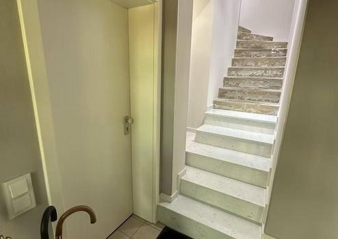 Flur mit Wohnungseingangstür aus dem Gemeinschaftstreppenhaus und mit Treppe in das Dachgeschoss. Glastür zum Büro mit Gartenblick und Laminatboden. Küchen-, Ess- Wohnzimmerbereich als großer offener Raum gestaltet, Küchenbereich gefliest und von zusätzlichem Dachfenster mit elektrischen Rollladen erhellt. Zweifacher Zugang zum Süd-West-Balkon. Büro und Wohnzimmerbereich mit vorbereiteter Klimatisierung.
