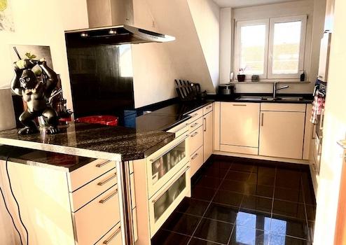 Ein besonderes Highlight ist die hochwertige Einbauküche, die nicht nur optisch überzeugt, sondern auch funktional sehr gut ausgestattet ist. Sie verfügt über Küchengeräte von Neff und eine elegante schwarze Arbeitsfläche, die der Küche einen modernen und exklusiven Charakter verleiht.