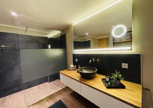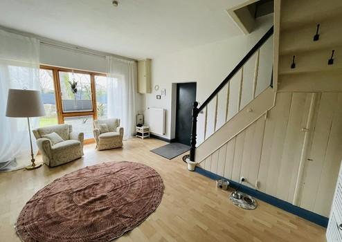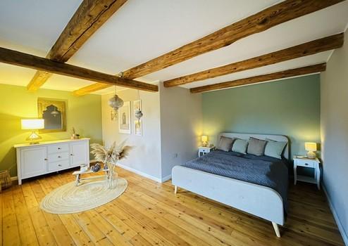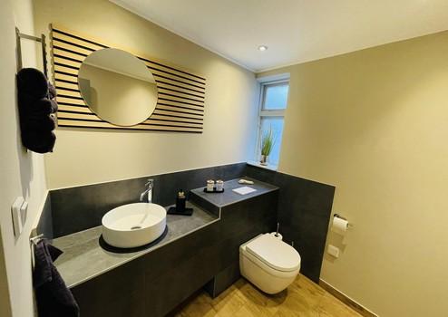 Das Hauptgebäude gliedert sich in eine Wohneinheit im Obergeschoss sowie eine Wohneinheit im Untergeschoss. Beide Einheiten sind über eine interne Treppe miteinander verbunden, die bei Bedarf abschließbar ist. Dadurch ist sowohl ein offenes, verbundenes Wohnen als auch eine klare Trennung der Wohneinheiten möglich.