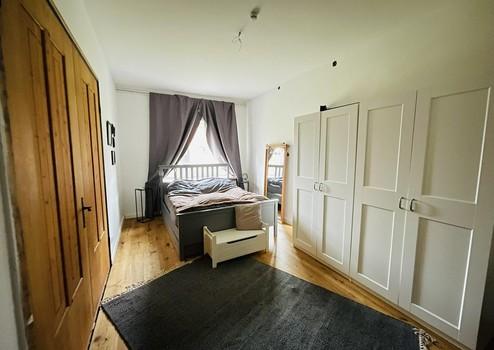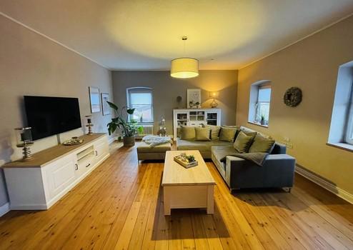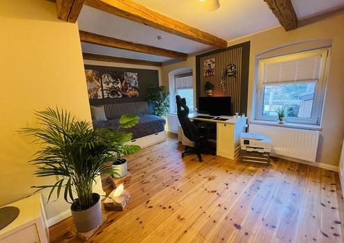 Die Wohneinheit im Obergeschoss präsentiert sich vollständig renoviert und teilweise modernisiert. Helle, großzügige Räume schaffen ein einladendes Wohnambiente. Herzstück ist der Wohnbereich mit einem vor etwa drei Jahren installierten Kamin. Die Küche mit Essbereich ist mit einer ca. vier Jahre alten Einbauküche inklusive hochwertiger Geräte (Backofen, Mikrowelle, Induktionskochfeld, Geschirrspüler, Dunstabzugshaube sowie Kühl-Gefrierkombination) ausgestattet. Zwei flexibel nutzbare Schlafzimmer ein vollständig modernisiertes Badezimmer sowie ein zentraler Flur runden diese Wohneinheit ab. Sie ist ohne weiteren Renovierungsaufwand nutzbar und eignet sich sowohl zur Eigennutzung als auch zur sofortigen Vermietung.