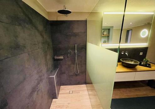 Die Wohneinheit im Untergeschoss ist teilmodernisiert und bietet weiteren Gestaltungsspielraum. In den Räumen „Wohnen“, „Schlafen 1/Büro“ sowie „Schlafen 2“ wurde neuer Estrich eingebracht, zudem wurde eine Fußbodenheizung im Rücklauf der Heizkörper integriert. In Wohnen und „Schlafen 1/Büro“ wurde Echtholzparkett verlegt. Der Raum „Schlafen 2“ befindet sich noch im Rohbauzustand. Küche und Bad entsprechen nicht mehr dem heutigen Standard und sollten erneuert werden. Insgesamt ist die Einheit grundsätzlich bezugsfähig, bietet jedoch Raum für weitere Modernisierung.