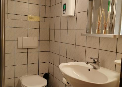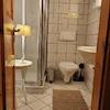 Dusche, WC, Waschmaschinenanschluss, Wandspiegel, Handtücher